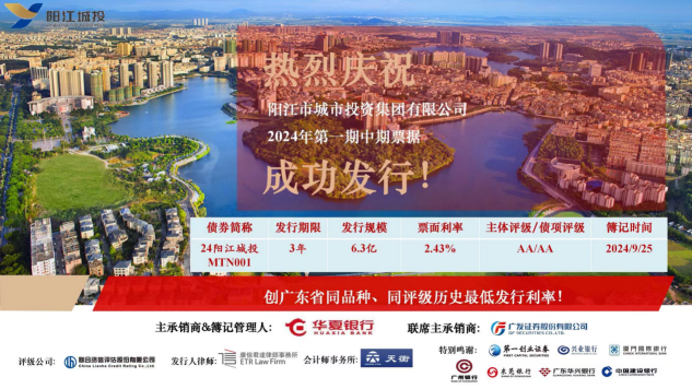 2024年9月26日,市城投集團(tuán)在中國銀行間交易商協(xié)會成功發(fā)行“陽江市城市投資集團(tuán)有限公司2024年第一期中期票據(jù)”。本期債券發(fā)行規(guī)模為6.3億元,期限為3年,票面利率2.43%,全場倍數(shù)超過2.52倍。本期債券創(chuàng)下了廣東省同期限、同評級債券歷史最低發(fā)行利率。